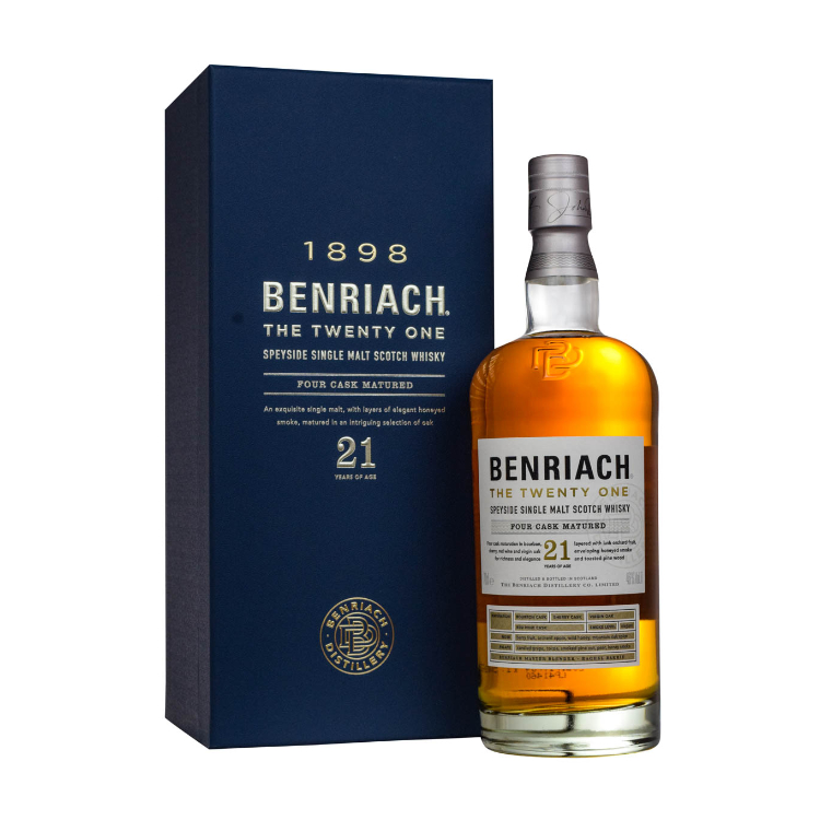 An sweet, smoky and elegant 21-year-old single malt from Benriach that is made with a combination of peated and un-peated spirit and matured in a combination of bourbon barrels, sherry casks, virgin oak casks and Bordeaux red wine casks. The result is aromas of berry compote, wild honey, crunchy apples, spicy oak and delicate smoke that fill the nose, complemented by notes of grape, dark chocolate, smoked pine nuts, caramelised pear and honey smoke throughout the palate.
