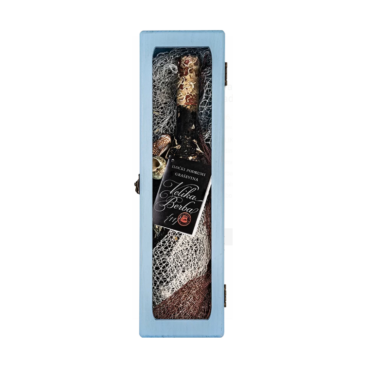 Graševina Velika berba is a pure varietal wine obtained from carefully selected grapes harvested in the unique wine-growing location of Principovac and produced by a special vinification method, three-month mixing on fine lees and three-year maturation in wooden barrels in the ideal conditions of the Old Cellar from 1450. Wine of intense yellow color with golden reflections. On the nose, varietal recognition, expressive minerality and complexity with accentuated fruitiness. The taste is luxurious, elegant with a bittersweet, soft and unique finish with a discreet touch of the Adriatic. The influence of salt and waves felt exclusively on the cork, while the dance of mistral, tramontana, bura and south on the bottles created a unique record from the depths of the sea.