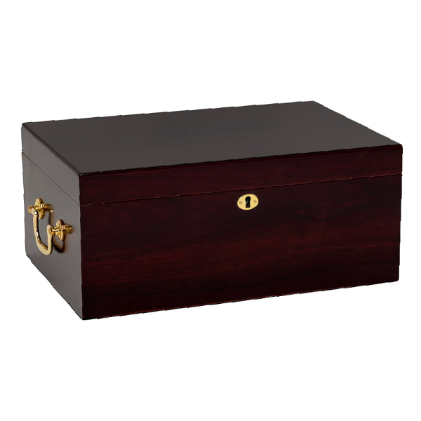 Designed with simple clean lines, features gold plated lock and key, 1 large rectangle humidifier, 1 glass hygrometer with brass frame and 2 dividers at bottom lined with premium spanish cedar. Capacity: 100 Cigars. Dimensions: W38 x D25,4 x H16.5 cm