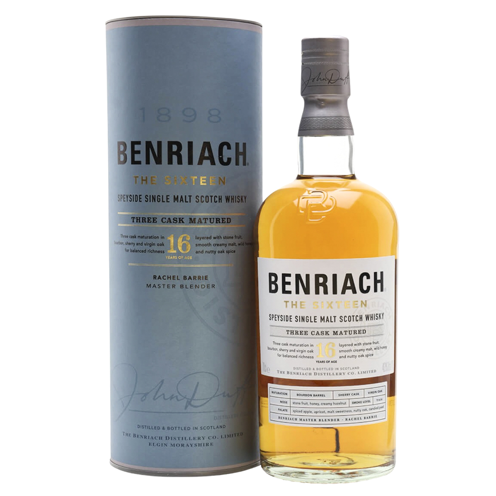 Bogat i složen 16-godišnji single malt iz Benriacha, The Sixteen sazrijevao je u kombinaciji ex-bourbona, ex-sherry-a i novih hrastovih bačvi. Arome meda, kremastih lješnjaka, pečenih jabuka, đumbira i marelica ispunjavaju nos, upotpunjene notama medenog slada, pržene hrastovine, koštuničavog voća, jabuka pečenih s cimetom i pramenovima dima kroz nepce.