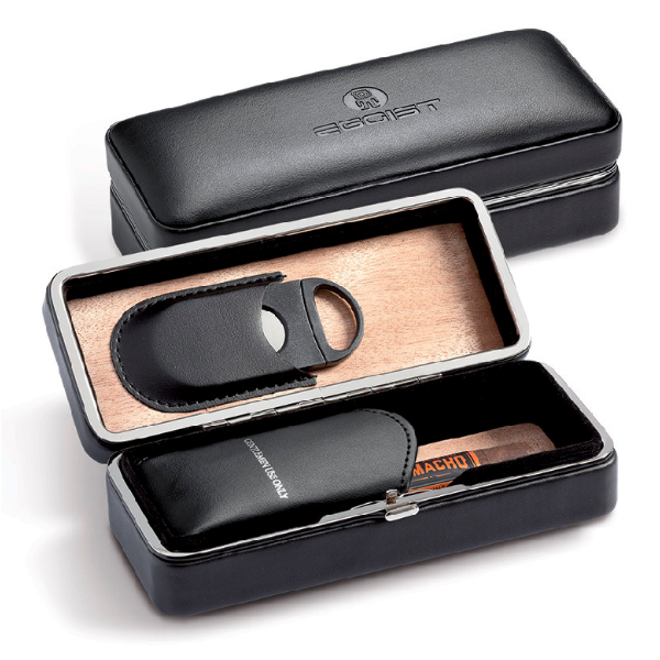 Putna torbica za cigare od umjetne kože. Praktičan i elegantan s cedrovinom s unutrašnje strane za dobro održavanje vaših cigara. Kapacitet: do 3 Toro cigare. Rezač uključen u cijenu. Dimenzije: V19 x Š9 x D5,8 cm